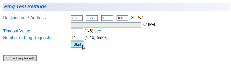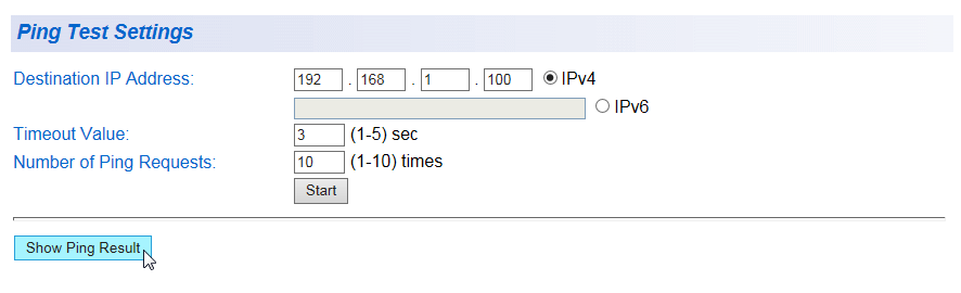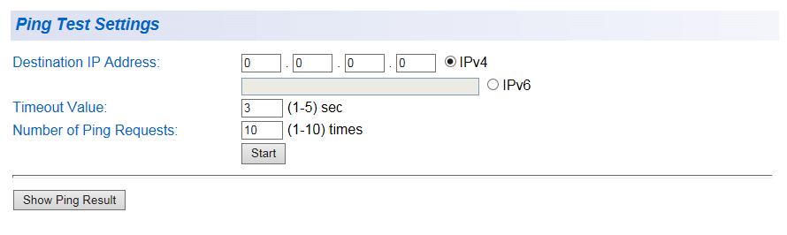 | Destination IP Address | Pingを実行する宛先のIPアドレスを設定します。IPv6はサポート対象外です。 デフォルトは「0.0.0.0」です。 |