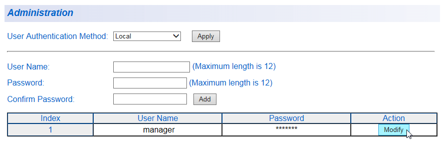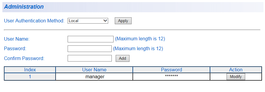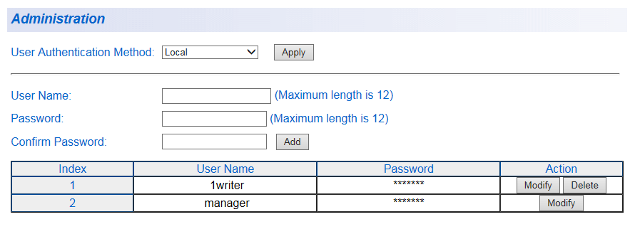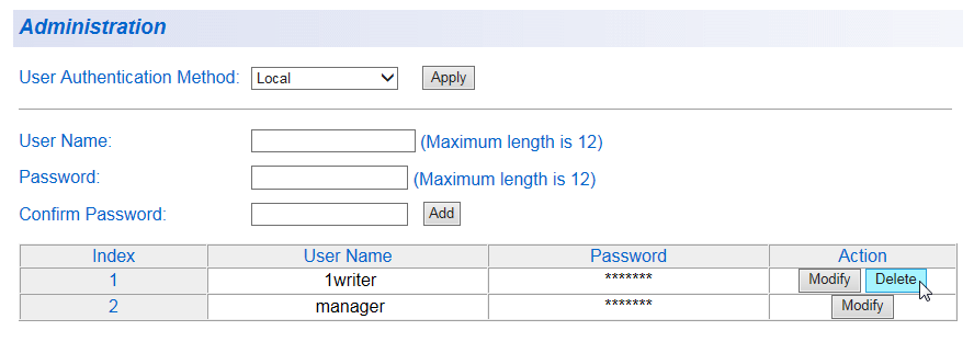 | Action | ログインユーザーに対する操作を選択します。 「Modify」をクリックすると、クリックしたログインユーザーの内容を変更します。 「Delete」をクリックすると、クリックしたログインユーザーを削除します。 デフォルト設定の「manager」「friend」は削除できません。 |