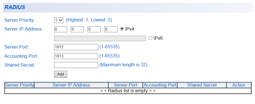 | Server IP Address | RADIUSサーバーのIPアドレスを指定します。IPv6はサポート対象外です。デフォルトは「0.0.0.0」です。 |