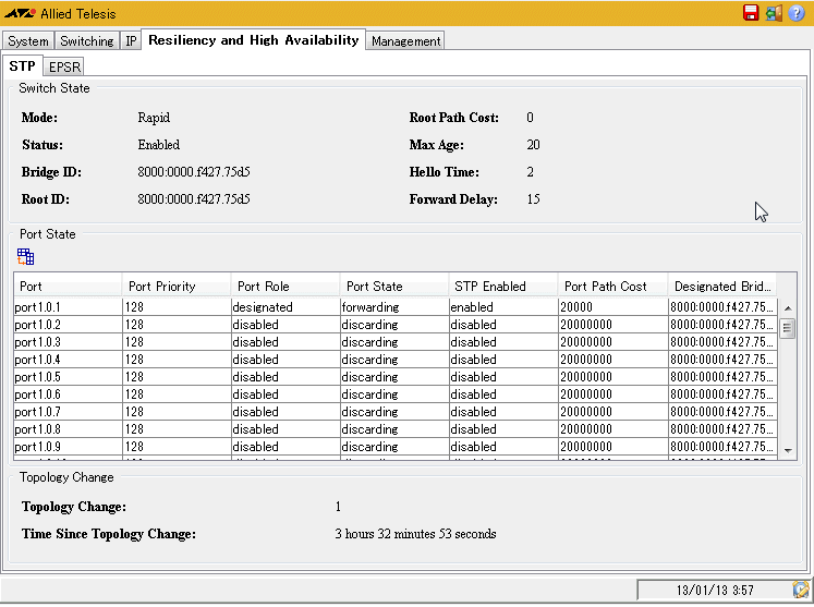 | Switch State / Bridge ID | ブリッジ識別子。ブリッジプライオリティー/MACアドレスが表示される |