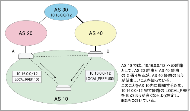 | 5 | LOCAL_PREF | well-known discretionary | AS内における(iBGP)経路選択のための優先度。大きいほど優先度が高い |