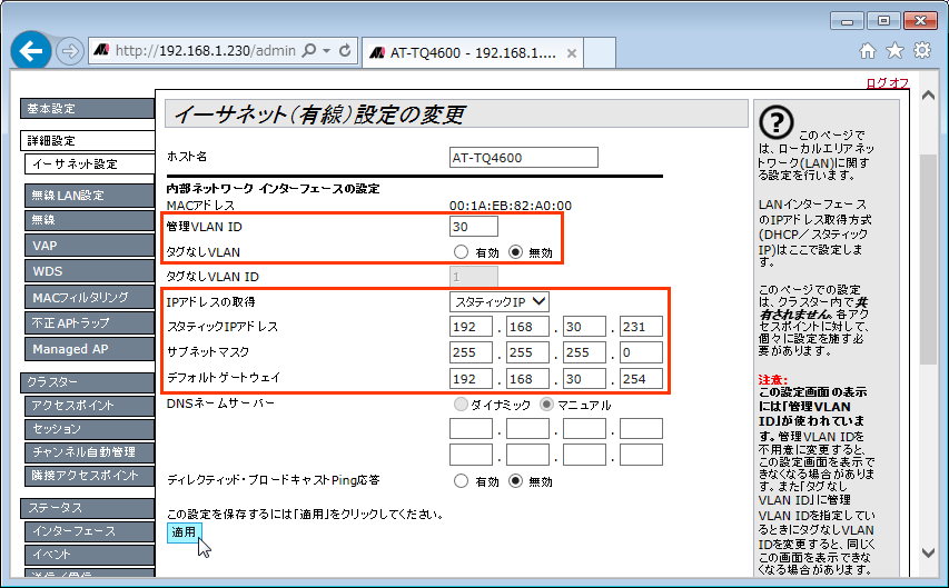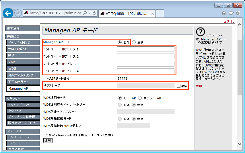Note - Managed APモードが「有効」のとき、アクセスポイントはイーサネットポートでワイヤレスマネージャーを検出し接続を試みます。接続に成功すると、アクセスポイントのWeb設定画面にはアクセスできなくなります。アクセスポイントだけで動作するモードに戻したい場合には、ワイヤレスマネージャーが存在しないネットワークにアクセスポイントを移動するなどして、ワイヤレスマネージャーと接続できない状態にしてからWeb設定画面にアクセスします。