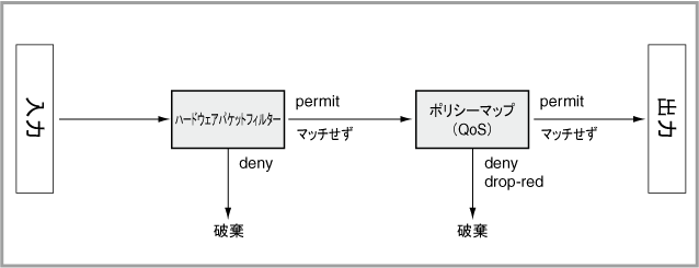 Note - 同一ポート上において、ハードウェアパケットフィルターとポリシーマップを併用している場合、該当ポートで受信したパケットの処理はハードウェアパケットフィルター、ポリシーマップの順に行われます。両方を通過しないとパケットは出力されません。