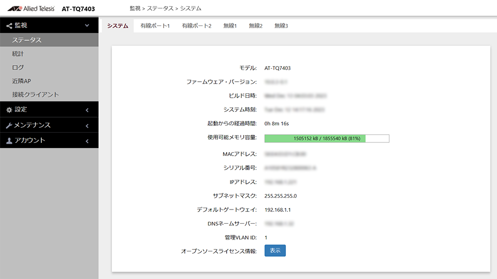 Noteご購入時には、「IPアドレスの取得」が「DHCP」となっています。DHCPサーバーが存在しないネットワーク環境でこのIPアドレスにアクセスしてください。「設定 / システム」の「通信」画面で「IPアドレスの取得」を「スタティックIP」に変更できます。