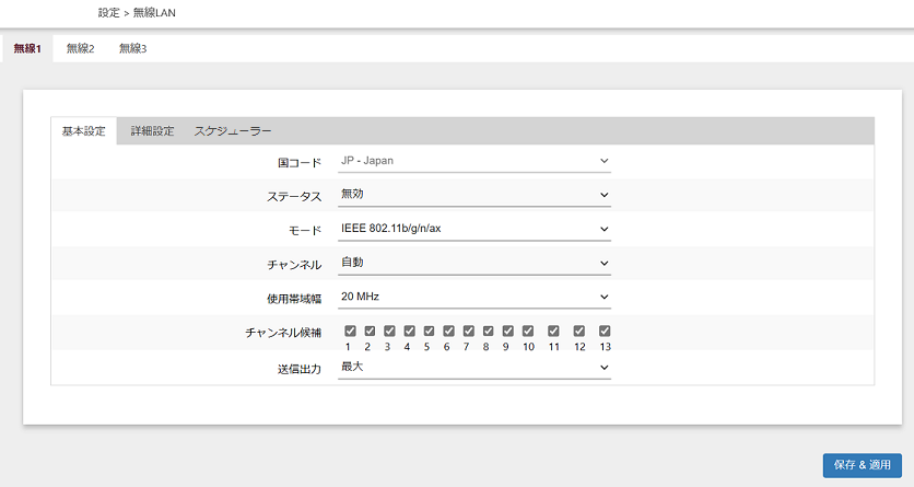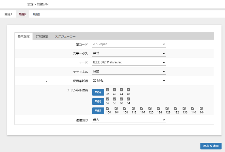 | 使用帯域幅 | 20MHz、40MHz、80MHz、160MHzから選択します。デフォルトは「20MHz」です。 | ||||||||||||||