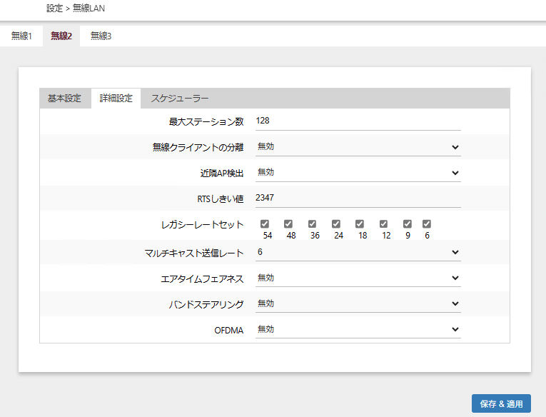 | 最大ステーション数 | 無線2で接続可能な無線クライアント数を0~128の数値で設定します。 「0」に設定した場合、無線クライアントはその周波数帯で接続されません。デフォルトは「128」です。 |