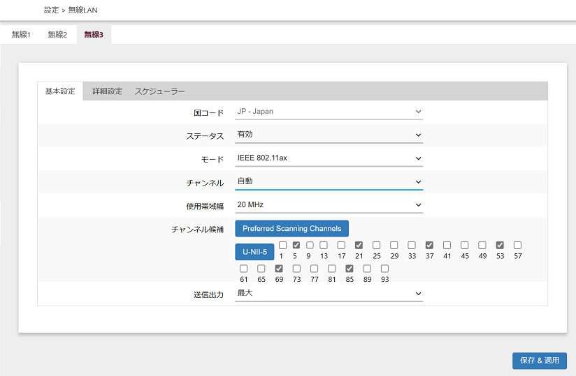 | チャンネル候補 | 「チャンネル」で「自動」が選択されている場合に、自動選択されるチャンネルの候補を設定します。チェックが付いていると候補になります。チェックが外れていると候補対象外となりそのチャンネルは使用されません。 「U-NII-5」ボタンをクリックすると、チャンネル候補すべてのチェックボックスにチェック印を付けます。 デフォルトでは「Preferred Scanning Channels」にチェックが付いています。