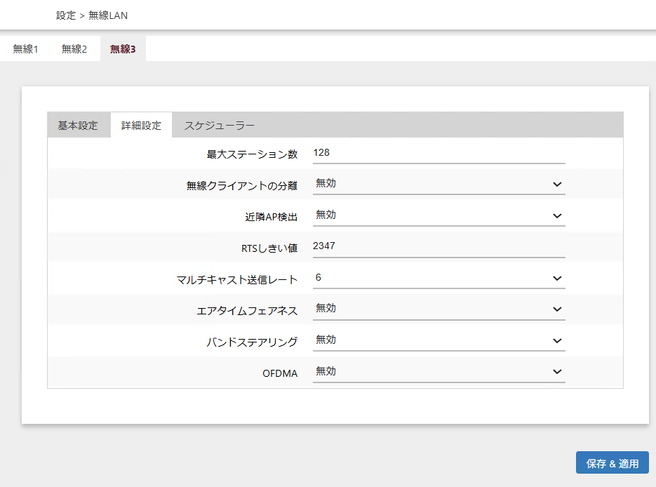 | 最大ステーション数 | 無線3で接続可能な無線クライアント数を0~128の数値で設定します。 「0」に設定した場合、無線クライアントはその周波数帯で接続されません。デフォルトは「128」です。 |