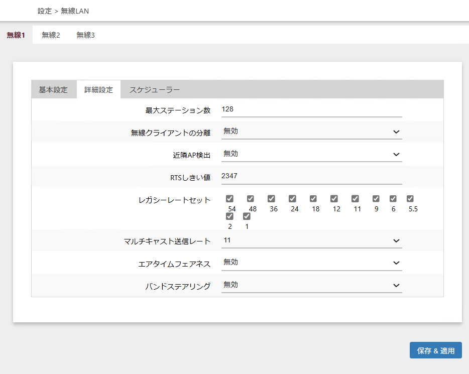 | レガシーレートセット | 通信プロトコルがIEEE 802.11b/gの場合のレート(通信速度)を設定します。デフォルトでは 54、48、36、24、18、12、11、9、6、5.5、2、1 が選択されています。 | ||||||||||||||||||||||||