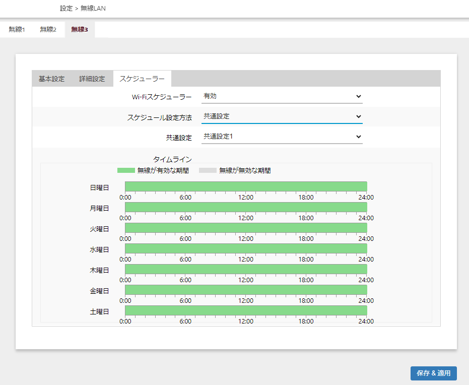 Noteスケジューラー機能は無線、VAP個々に設定可能ですが、無線側で設定したスケジュールが優先されます。例えば、無線側で7:00~9:00の間を無効に設定している場合、VAP側の設定で8:00~9:00の間を有効にしても、無線側の7:00~9:00が優先されます。