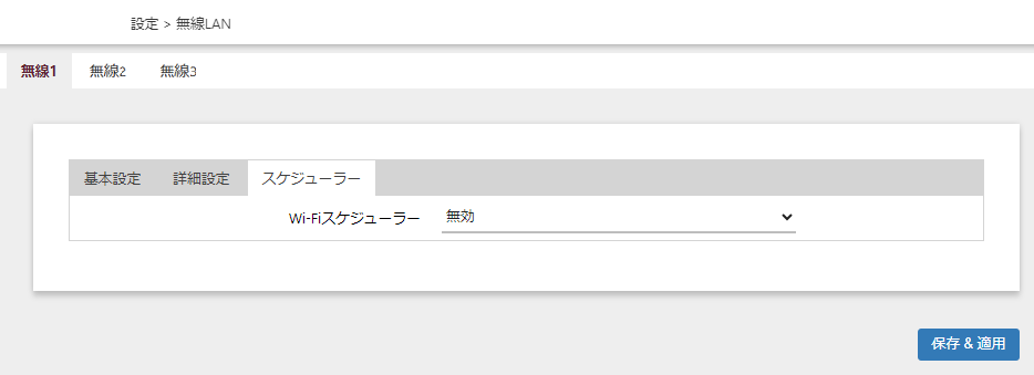 | Wi-Fiスケジューラー | 無線の有効・無効のスケジュールを行います。設定したスケジュールで無線の有効・無効を切り替える場合は「有効」、行わない場合は「無効」を選択します。デフォルトは「無効」です。 |