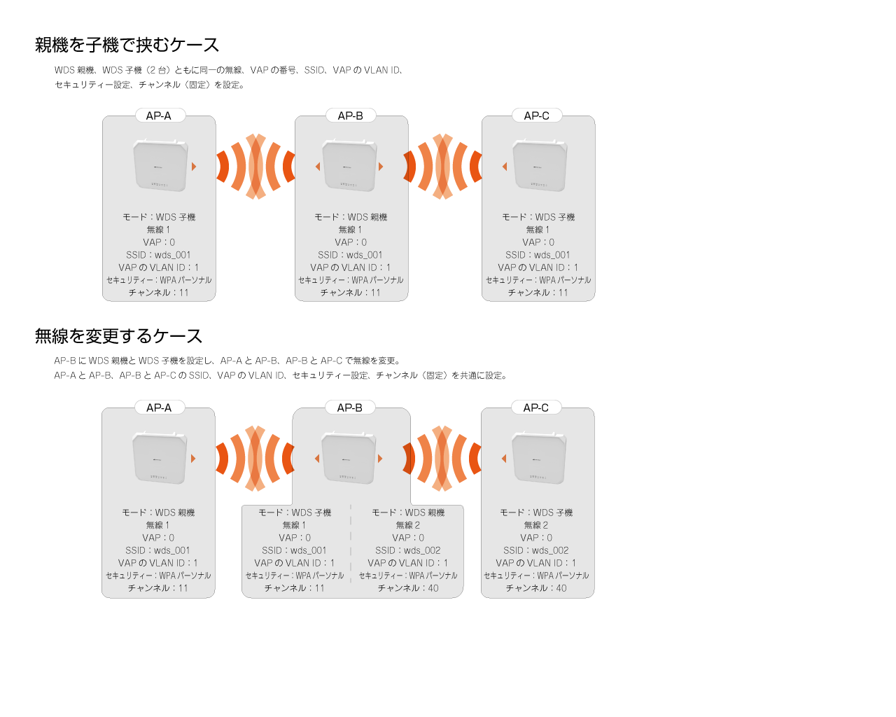 NoteWDS親機とWDS子機の無線、VAP、SSID、VAPのVLAN ID、セキュリティー、チャンネルを同じ設定にしてください。