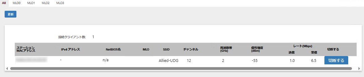 | 接続クライアント | 本製品に接続しているステーションのMACアドレス、SSID、チャンネルなどの確認が行えます。 |