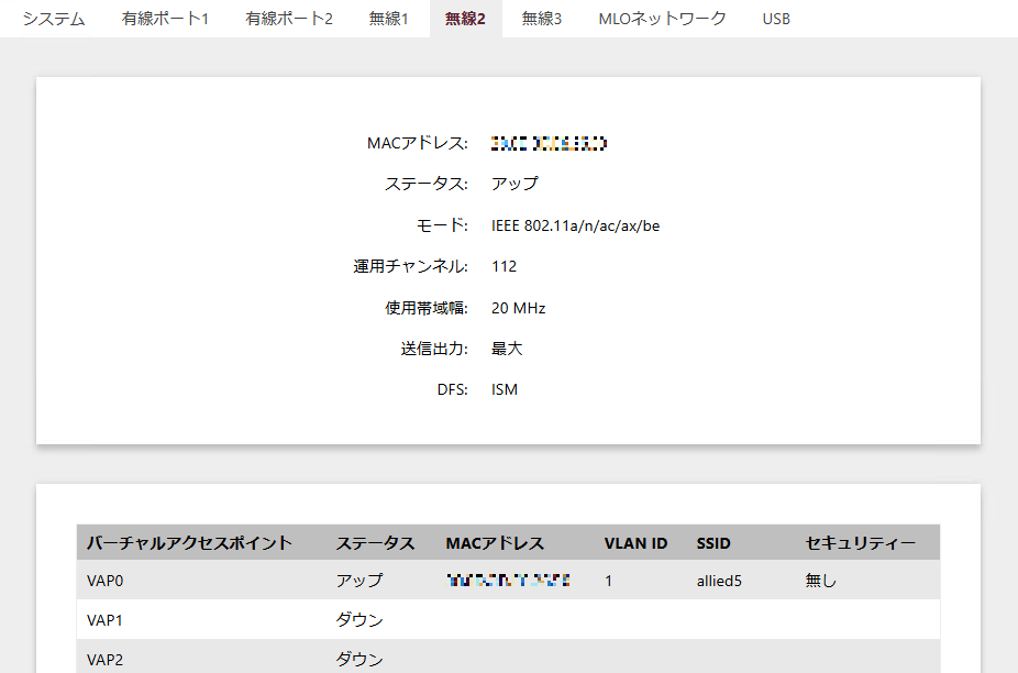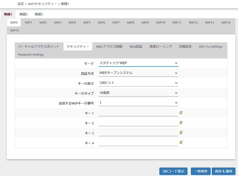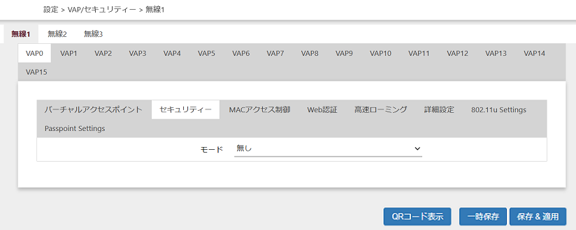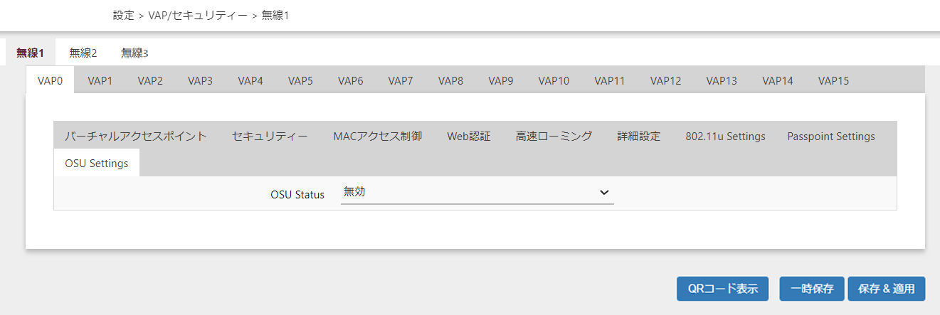 Note無線1、無線2、無線3のVAP0は、常に有効で無効にできません。そのため、各無線のステータスを「有効」にするとVAP0も有効となり、デフォルト状態(セキュリティー:無し)で接続可能になるため、各無線のステータスを「有効」にする前に、SSID、セキュリティーの設定を行ってください。