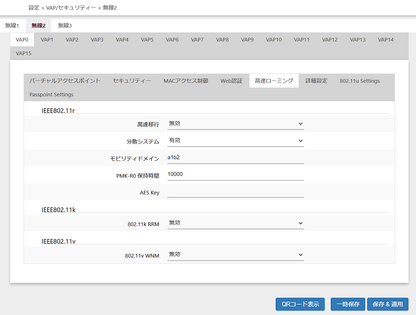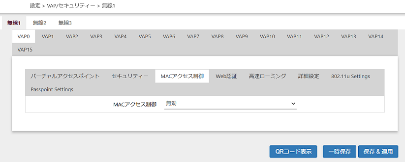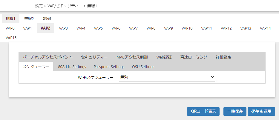 | VAP/セキュリティー | バーチャルアクセスポイント(仮想的な無線AP)、セキュリティー、MACアクセス制御、Web認証、高速ローミング、QRコード、詳細設定、スケジュール機能の設定、Passpointに関する設定が行えます。 |