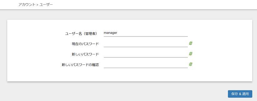 | ユーザー名(管理者) | 管理画面にログインする際に使用するユーザーIDです。 1~12文字の半角英数字で入力します。 ユーザー名は英字から始まる必要があります。ご購入時における初期設定は「manager」です。 ユーザー名を変更する場合は、「新しいパスワード」「新しいパスワードの確認」も入力してください。これらを空欄にすると、パスワードが未設定となります。 Noteユーザー名に「root、daemon、ftp、network、nobody、lldp」の単語は使用しないでください。 |