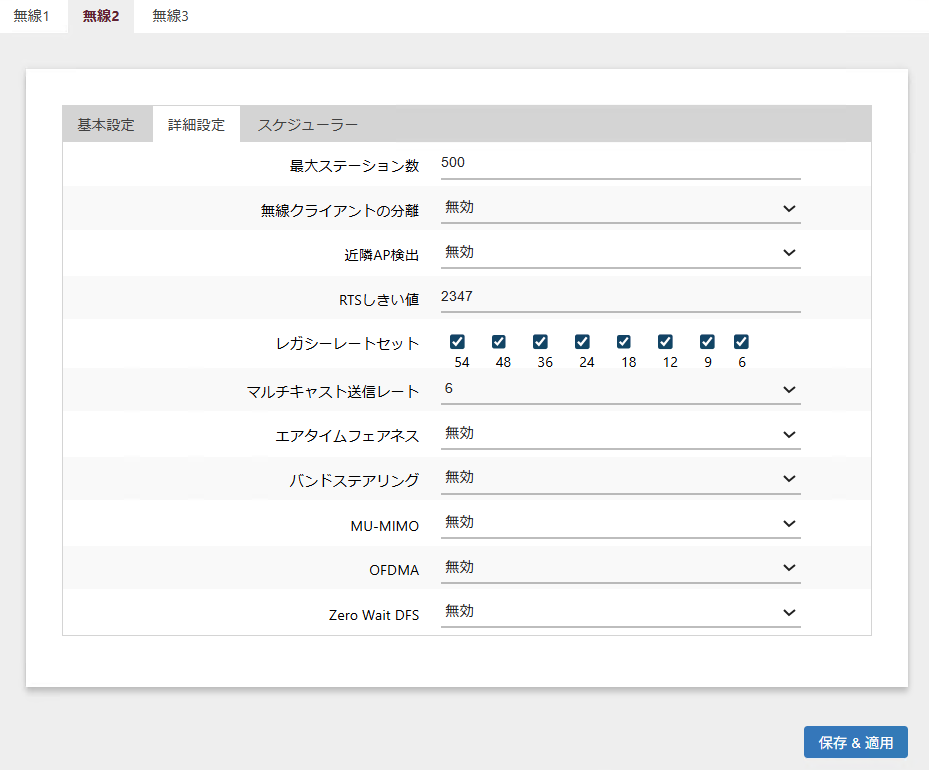 NoteWDSとOFDMA・MU-MIMO・Zero Wait DFSの併用はできません。VAPモードでWDSを有効にすると、対象の無線においてOFDMA・MU-MIMO・Zero Wait DFSは強制的に無効になります。