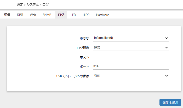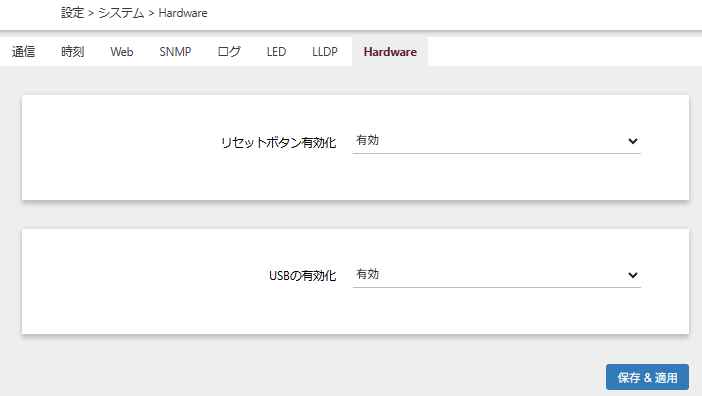 | システム | IPアドレス設定、時刻、Web管理画面へのアクセス設定、SNMPエージェントの設定、ログの転送設定、LED設定、電力ネゴシエーション、リセットボタンの設定、USBの設定が行えます。 |