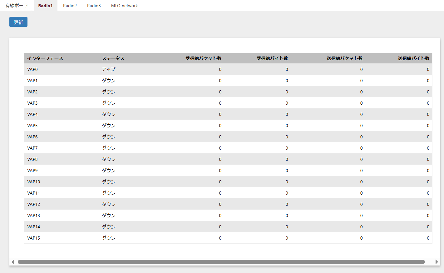 | 統計 | 有線ポート、無線LANインターフェース、MLOネットワークのステータス、送受信パケット、送受信バイト数の確認が行えます。 |
