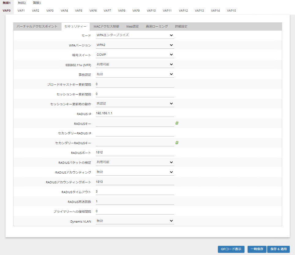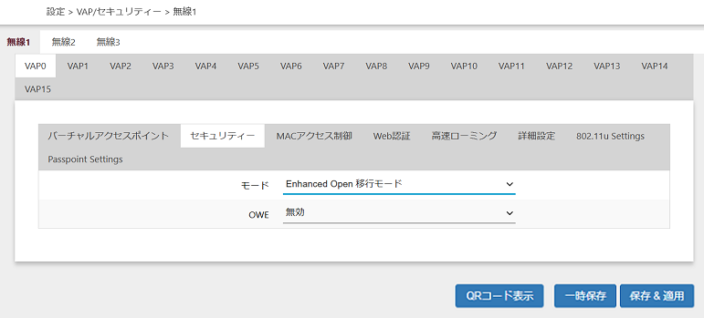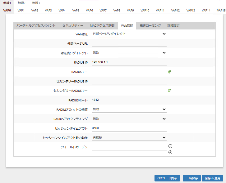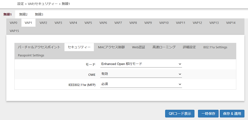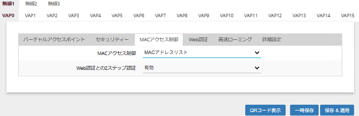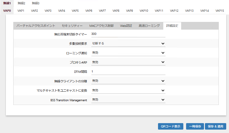 複数のVAPページに対して設定変更を行う場合は、別のVAPページに移動する前に「一時保存」ボタンをクリックし、設定変更を仮保存してから別のVAPページに移動してください。すべてのVAPの設定変更が完了したら「保存&適用」ボタンをクリックしてください。