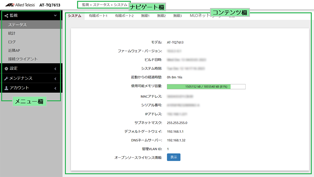 | ステータス | システム情報、有線ポート、無線LANインターフェース、MLOネットワーク、USBデバイスに関する情報の確認が行えます。 |