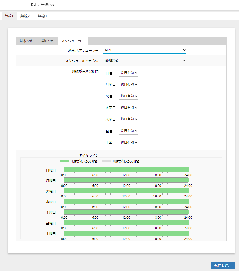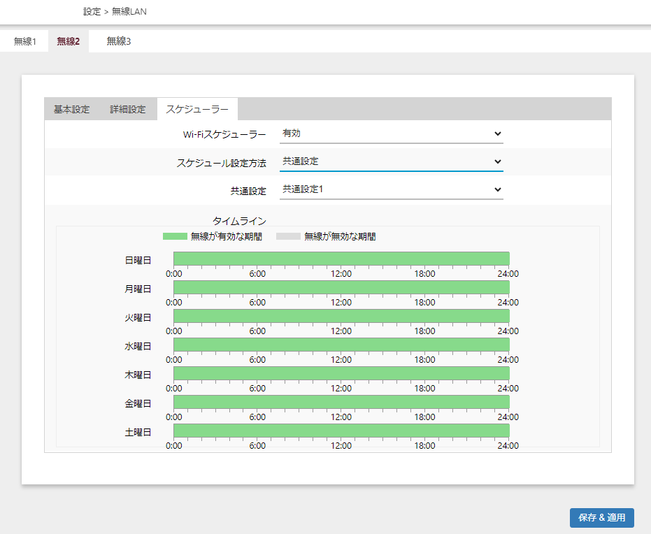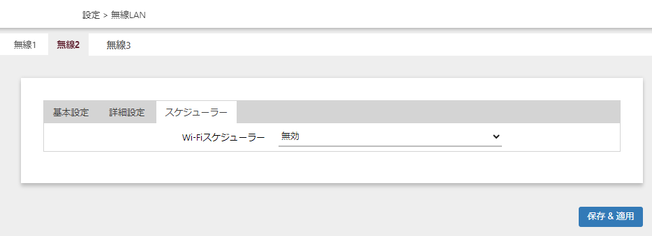 | Wi-Fiスケジューラー共通設定 | 無線LAN単位、VAP単位で指定した日時・時刻に無線を有効・無効にできるWi-Fiスケジューラー機能の設定が行えます。 |