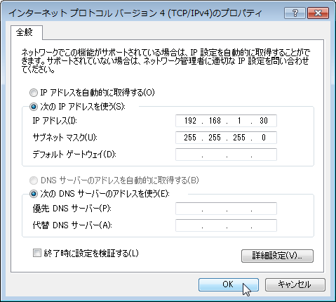 「IPアドレス」には「192.168.1.xxx」(xxxは、1から254までの値)を、「サブネットマスク」には「255.255.255.0」を設定します。