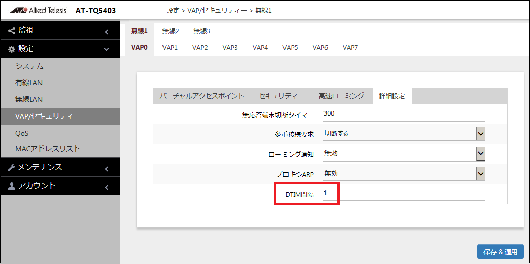 DTIM間隔の数値を大きくすることにより省電力の効果が大きくなりますが、応答が遅くなります。