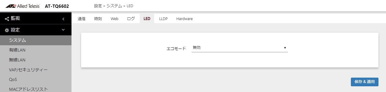 本製品のLEDを点灯する場合は「無効」、しない場合は「有効」を選択します。デフォルトは「無効」です。