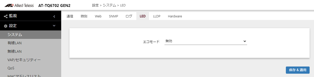 本製品のLEDを点灯する場合は「無効」、点灯させない場合は「有効」を選択します。デフォルトは「無効」です。