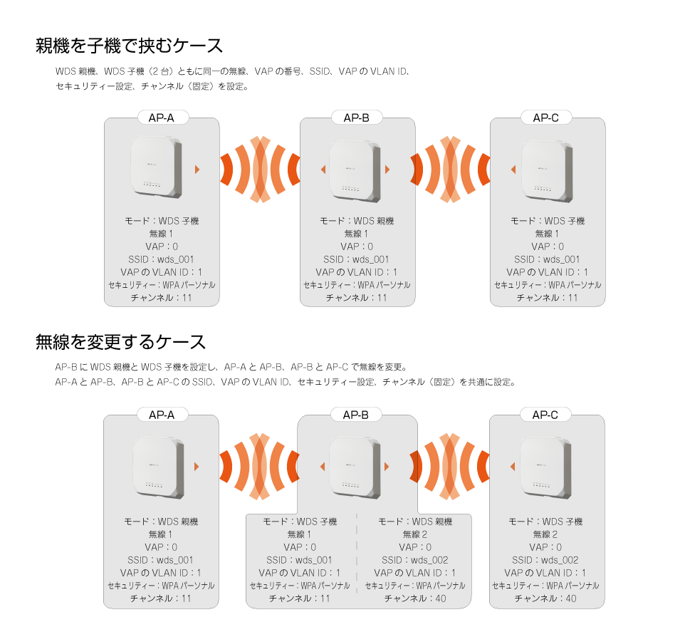 NoteWDS親機とWDS子機の無線、VAP、SSID、VAPのVLAN ID、セキュリティー、チャンネルを同じ設定にしてください。