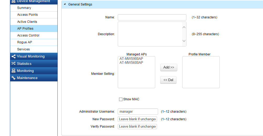 | Member Setting | プロファイルを適用するアクセスポイントを選択します。 Managed APs: 本製品の管理下にあるアクセスポイントのデバイス名を表示します。 Profile Member: プロファイルを適用するアクセスポイントのデバイス名を表示します。 Add>>: プロファイルを適用したいアクセスポイントを「Managed APs」から選択して、「Add>>」ボタンをクリックすると、選択したアクセスポイントのデバイス名が「Profile Member」に移動します。 <<Del: プロファイルの適用を止めたいアクセスポイントを「Profile Member」から選択して、「<<Del」ボタンをクリックすると、選択したアクセスポイントのデバイス名が「Managed APs」に移動します。 Show MAC:アクセスポイントの一覧にMACアドレスを表示するか否か。 「チェックあり」にすると、「Managed APs」「Profile Member」に「デバイス名 (アクセスポイントの機種名/対応する周波数帯とプロトコル/MACアドレス)」を表示します。 「チェックなし」にすると、「Managed APs」「Profile Member」にデバイス名のみを表示します。 デフォルトは「チェックなし」です。 |