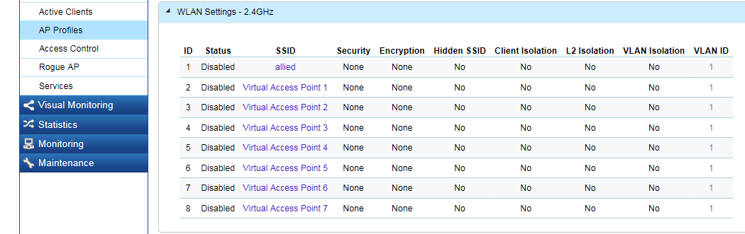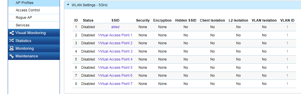 | SSID | 該当のVAPが使用するSSID(ネットワーク名)を入力します。このSSIDは指定したVLAN IDに対応づけられます。 1〜32文字の半角英数字、記号(! " # $ % & ' ( ) * + , - . / < = > ? @ [ \ ] ^ _ ` { | } ~)または半角スペースで入力します。 デフォルトは、プロファイル番号1は「allied」、プロファイル番号2〜8は「Virtual Access Point 1〜7」です。 |