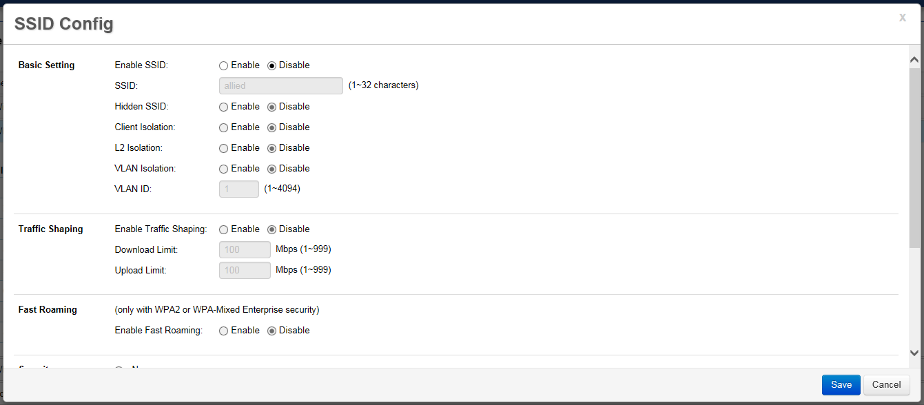 | Enable SSID | 該当のVAPを有効にするか否か。有効にする場合は「Enable」、無効にする場合は「Disable」から選択します。デフォルトは「Disable」です。 |