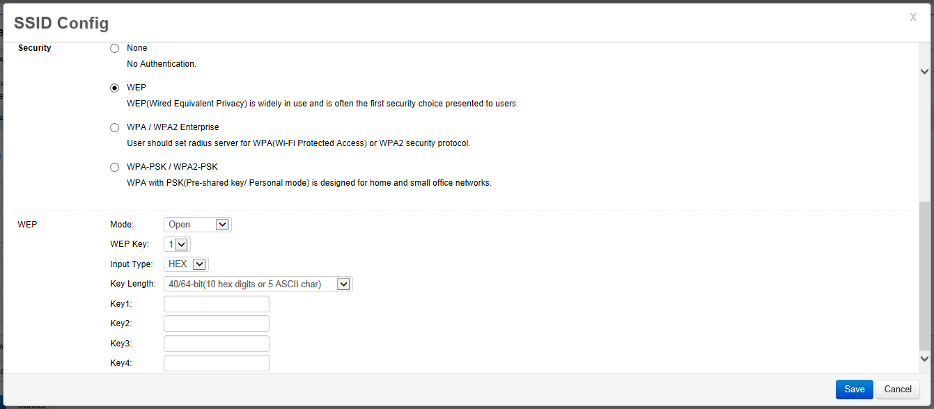 | Input Type | WEPキーの生成方法を選択します。デフォルトは「HEX」です。 HEX: 16進数(0〜9、A〜F、a〜f)でWEPキーを直接入力します。 入力されるWEPキーの大文字・小文字は区別されません。 ASCII: 任意の文字列からWEPキーが自動生成されます。 |