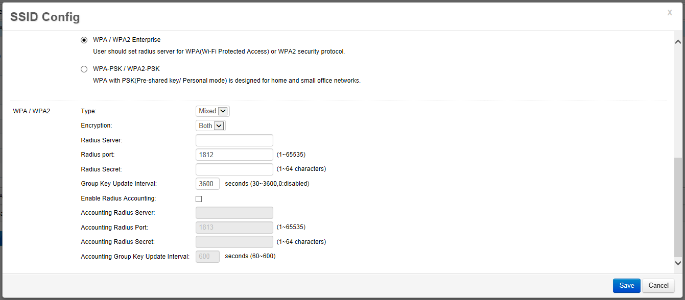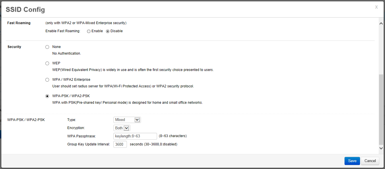 | Type | WPA/WPA2のバージョンを「WPA」、「WPA2」、「Mixed」から選択します。 「Mixed」では、WPA、WPA2の両方の認証方式に対応します。 デフォルトは「Mixed」です。 |