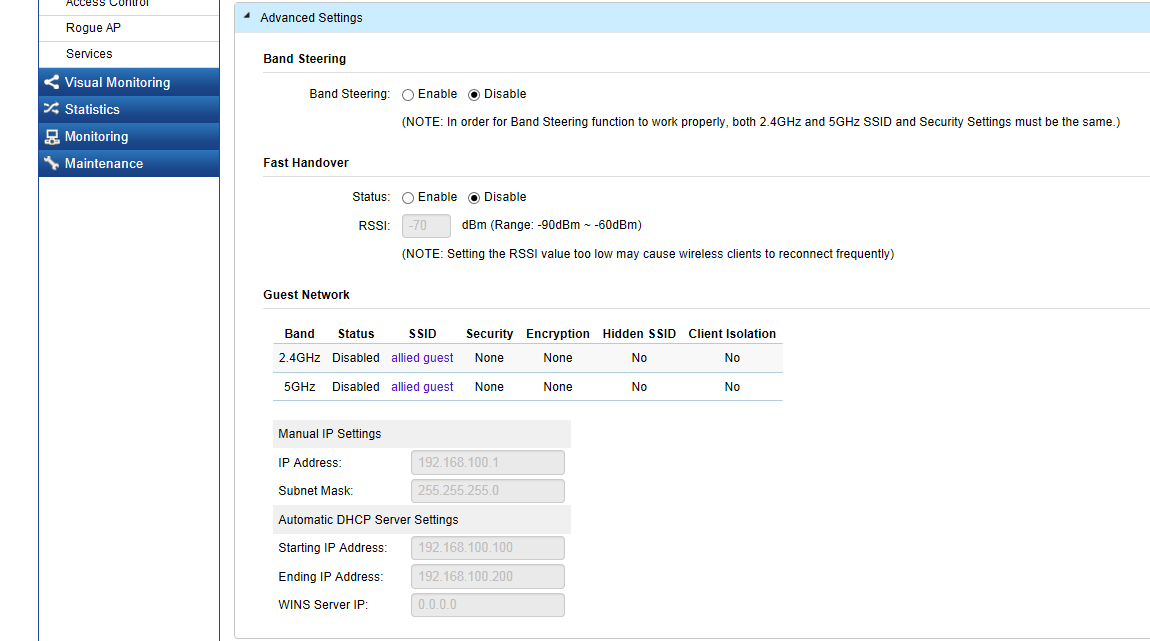 | Manual IP Settings | ゲストネットワークの無線クライアントから、有線ネットワーク側に対して使用されるIPアドレスとサブネットマスクの設定を行います。 |