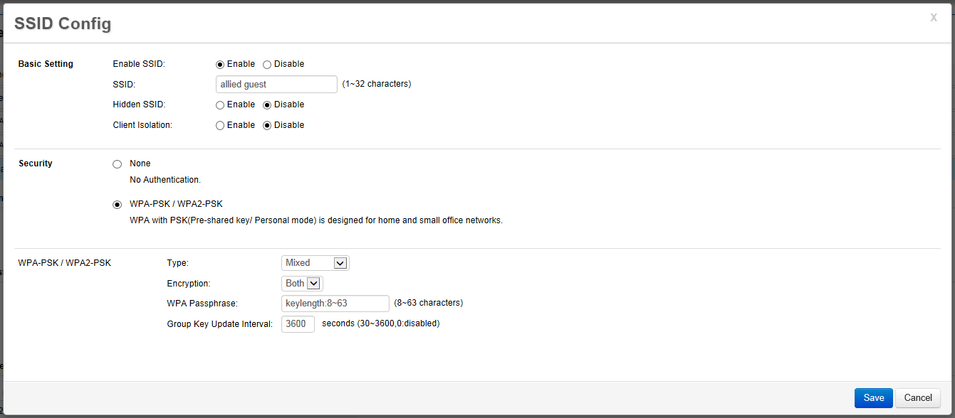 | Client Isolation | 同一のVAPに接続している無線クライアント同士の通信を許可するか否か。 許可しない場合は「Enable」、許可する場合は「Disable」にします。 デフォルトは「Disable」です。 |