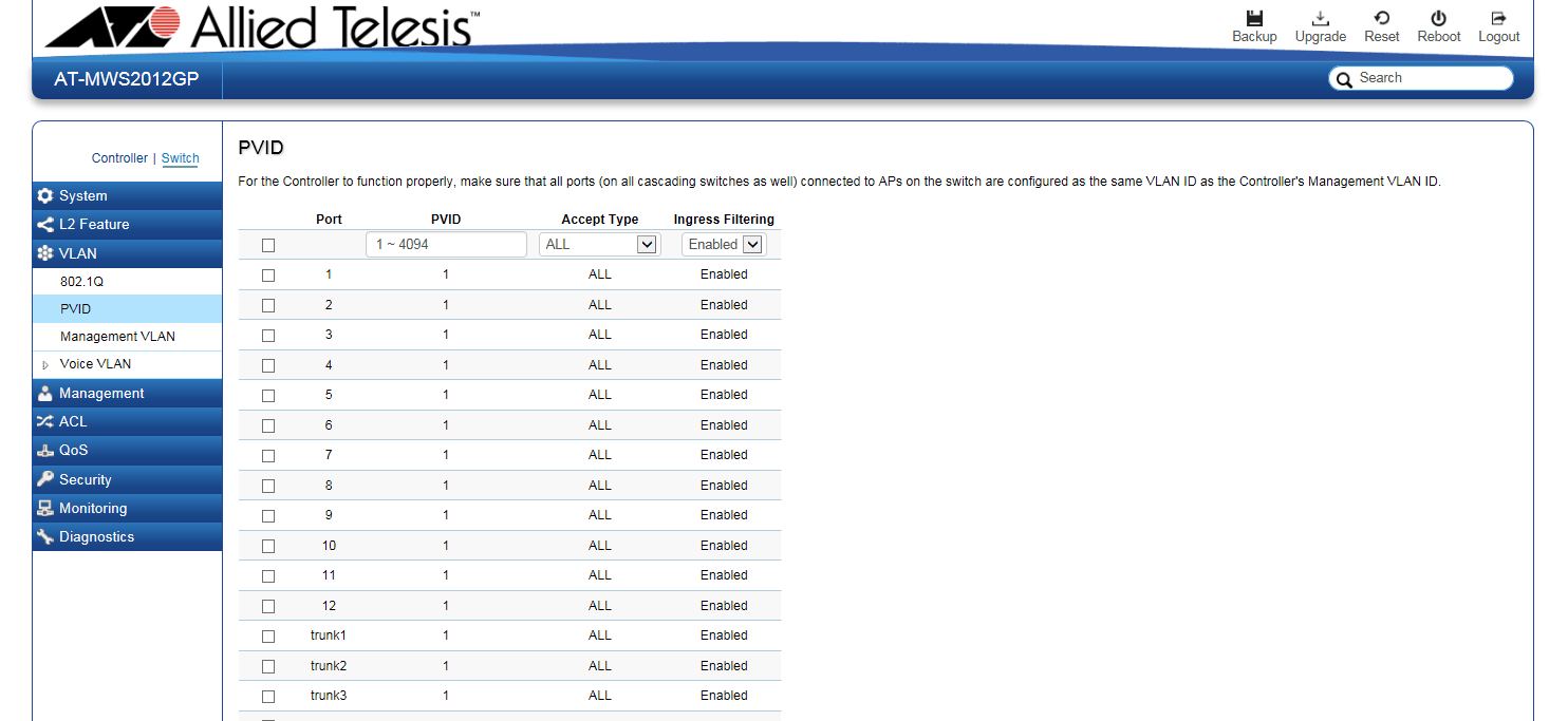 | Accept Type | 該当のポートで受け入れる受信パケットのVLANタグの有無を指定します。 ・Tagged Only:タグ付きパケットのみを受信します。タグなしパケットを受信した場合は破棄します。 ・Untagged Only:タグなしパケットのみを受信します。タグ付きパケットを受信した場合は破棄します。 ・ALL:タグ付きパケット、タグなしパケットの両方を受信します。 デフォルトは「ALL」(タグ付き/タグなしパケットの両方を受け入れる)です。 |