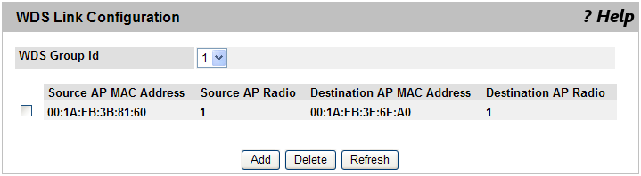| Add | WDSグループに加えたアクセスポイントのWDS接続の対を指定します。 |