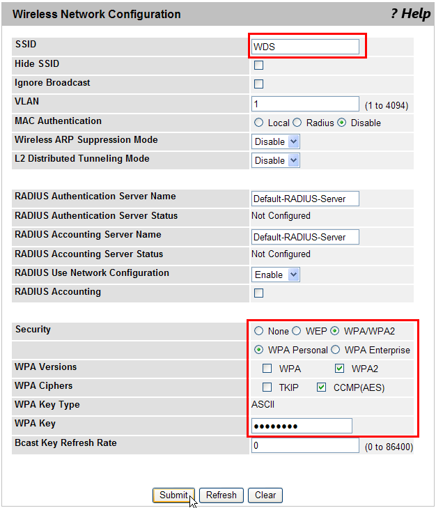 Note - WDS接続を行っているアクセスポイントで無線クライアントへの接続サービスを提供する場合は、WDS接続を行っている無線帯域とは別の無線帯域を使用してください(「VAP」タブで接続サービス用のNetwork設定を割り当ててください)。WDS接続、無線接続サービスの両方で同じ無線帯域を使用するとパフォーマンスが著しく低下します。