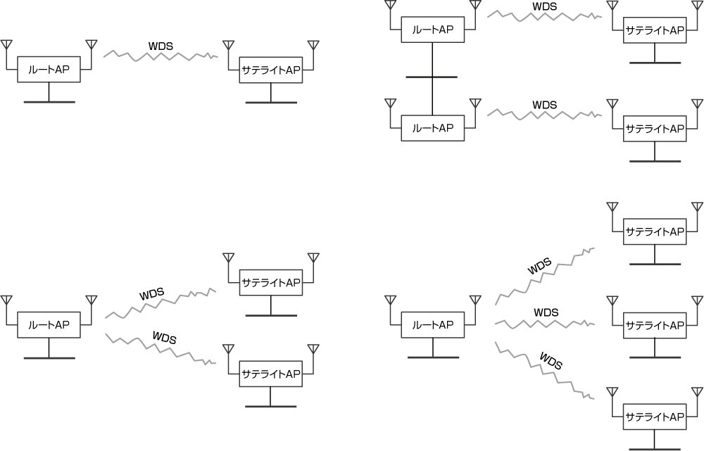 「サテライトAP」に設定されたアクセスポイントは、WDS接続が可能なアクセスポイント(ルートAP)の探索を行い、後述のWDSグループの設定に従い自動的にWDSリンクを張ります。WDSリンクはWPA2/AESで保護されます。
