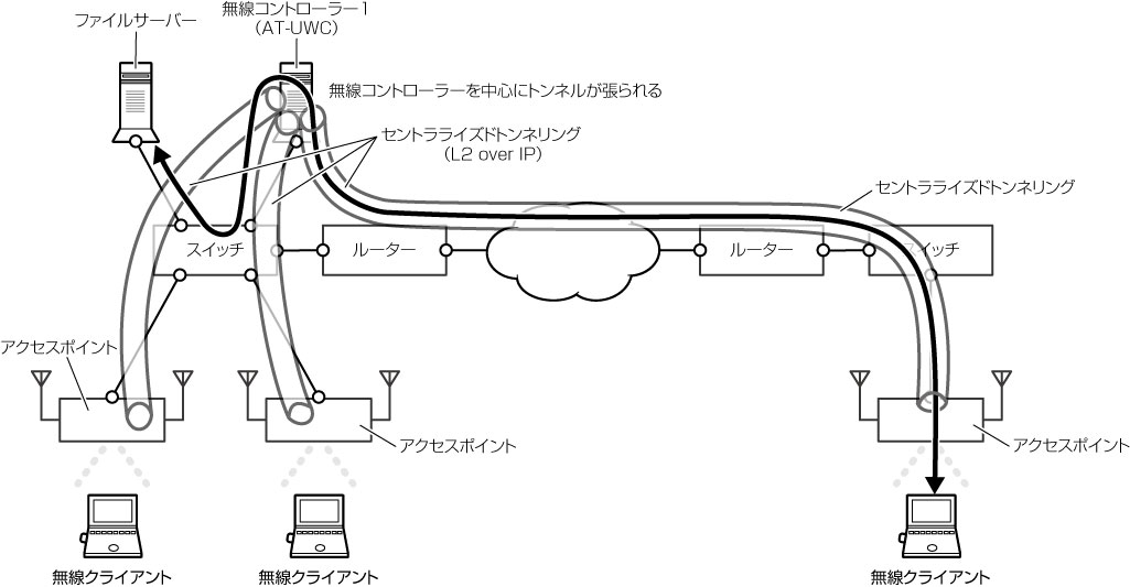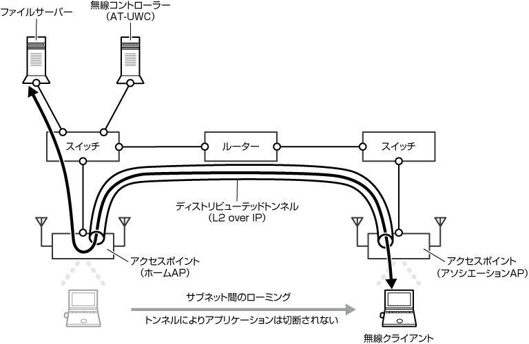 Note - ホームAPからアソシエーションAPに張られるトンネルは1本です。そのアソシエーションAPにローミングした無線クライアントが複数存在する場合は、トンネルの中に複数のセッションが存在します。