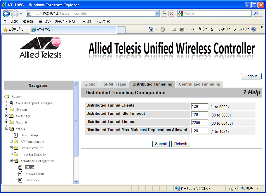 | Distributed Tunnel Idle Timeout | ローミングしている無線クライアントの無通信状態が持続したときに切断する秒数。30〜3600秒を設定可能。デフォルトは120秒。 |