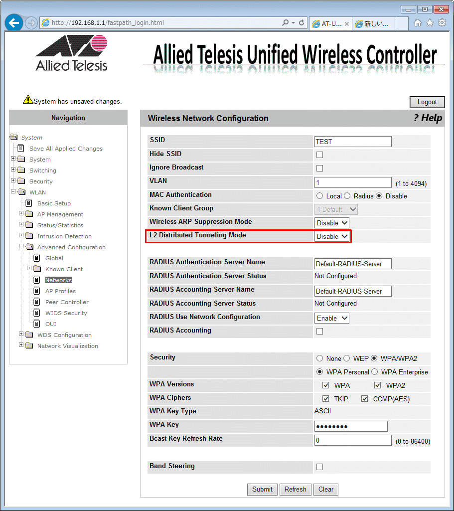 | Distributed Tunnel Clients | ホームAPからローミングできる無線クライアントの最大数。1〜8000を設定可能。デフォルトは128。 |